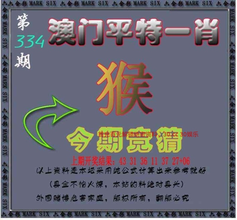 | 334期五码 | 46.31.03.33.06 | 開:猴46 |